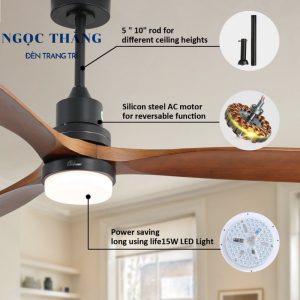 Quạt Trần Đèn Led 3 Cánh Gỗ Trang Trí Sảnh Phòng Khách Cao Cấp QT2010 Ngọc Thắng (Kèm remote điều khiển từ xa)